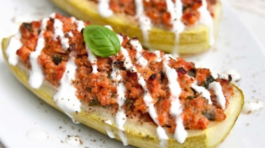 Разполовете почистените тиквички. Леко издълбайте вътрешността им и я накълцайте ситно.Загрейте зехтина и запържете накълцания лук. Добавете и вътрешността на тиквички, след това и каймата. Бъркайте и запържете, докато течността се изпари, разбъркайте с доматеното пюре и овкусете с подправките.Напълнете тиквичките и ги подредете в тава. Сложете да се изпекат в умерено загряна фурна, докато добият лек загар.Разбийте киселото мляко с малко копър и пасирания чесън. Поднесете тиквичките с този сос.