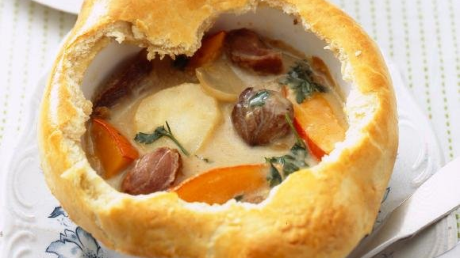 Повдигат се внимателно корите на купичките, сипва се вътре месното раги с тиква и отново се похлупват с хляба.