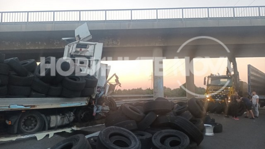 Влекачът с полуремарке с австрийска регистрация се блъснал в бетонен стълб, част от конструкцията на пътния възел. Тирът е превозвал гуми за камиони, които са се разпилели по пътното платно.