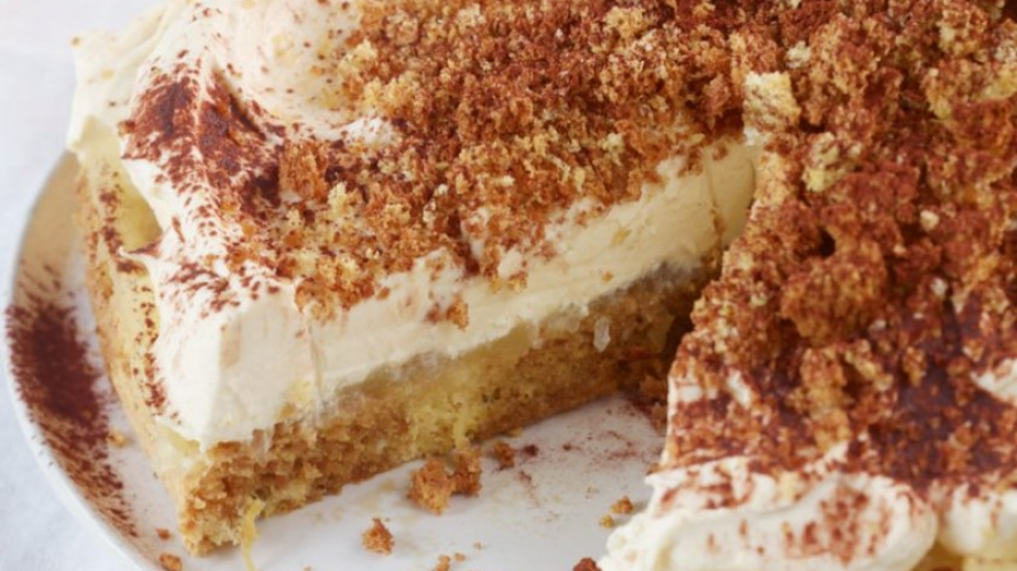 Изварата, маскарпонето, останалата захар, останалото амарето се разбъркват на гладка смес. Изсипва се върху ябълките и се заглажда.