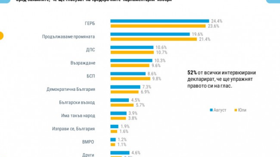 През август подкрепата за ПП е 19,6% сред гласуващите, за ГЕРБ е 24,4%. Силно оспорвана е третата позиция между ДПС с 10,6% и "Възраждане" с 10,3%. Гласовете от чужбина за двете формации вероятно ще се окажат решаващи при крайната подредба на самите избори.
