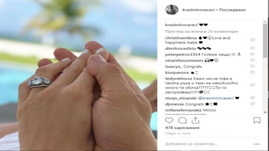 Цеци Красимирова се готви за сватба, след като преди броени часове се сгоди за богаташа Майкъл Струмейтис. Моделката показа снимка с невероятен годежен пръстен с огромен диамант, а под нея заваляха пожелания за много любов и дълъг живот. Част от приятелите на Цеци не крият изненадата си от съдбоносното решение, но всички са категорични, че двамата влюбени са родени един за друг, пише Хотнюз.