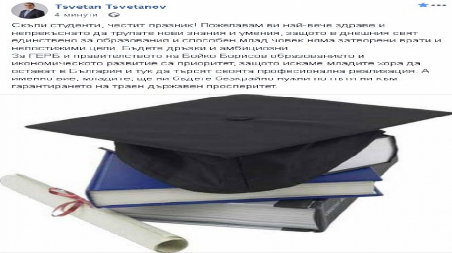 Председателят на ПГ на ГЕРБ Цветан Цветанов честити днешния празник на всички студенти