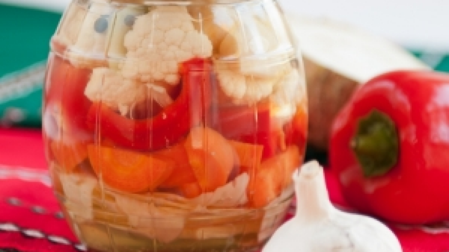 Салата от печени чушки и орехи върху краставица