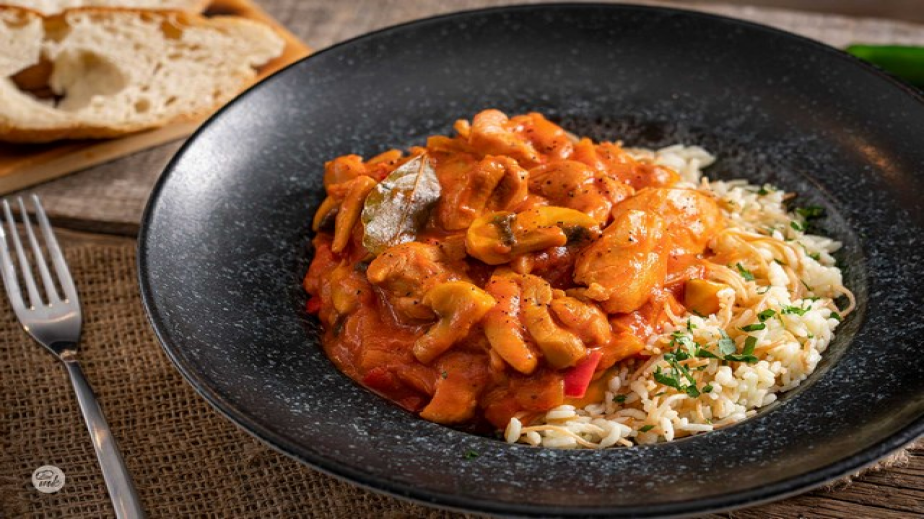 Прибавете нарязаното на кубчета пилешко месо, почистените и нарязани гъби и задушавайте за още около 4-5 минути под капак.