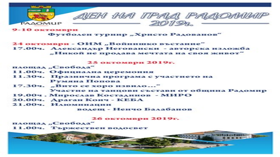 С невероятна програма ще бъдат изненадани радомирци на предстоящия празник за деня на града. По традиция на 26 октомври – Димитровден жителите на общината отбелязват своя празник. Официалната церемония и тържествения водосвет ще започнат в 11 ч. на площад “Свобода” на светлия християнски празник, но празничната програма тази година ще бъде ден по рано – 25 октомври /петък/.