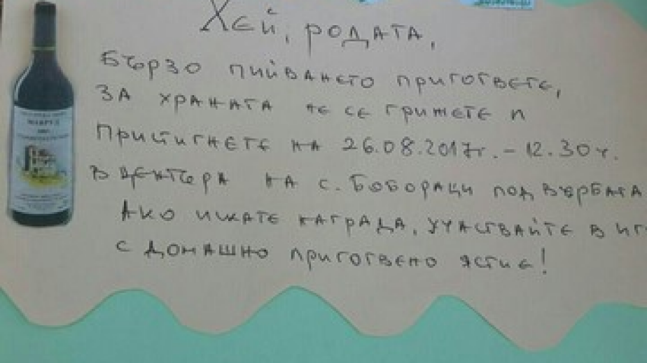 „Хей родата, бързо пийването пригответе, за храната не се грижете и пристигнете на 26 август в 12,30 ч. на центъра на Бобораци под върбата. Ако искате награда участвайте в играта с домашно приготвено ясие!“.