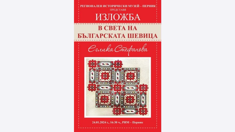 Изложба под наименованието "В света на българската шевица" ще представи в Перник везбарката Еглика Стефанова. Тя ще бъде открита дни преди Международния фестивал на маскарадните игри „Сурва“ в Регионалния исторически музей, съобщиха от институцията.