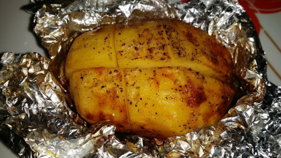 Сложете ги в средата на всеки лист фолио по един картоф и ги увийте хубаво, така че фолиото да прилепне по тях. Наредете ги в тава и печете на 220 градуса около час.