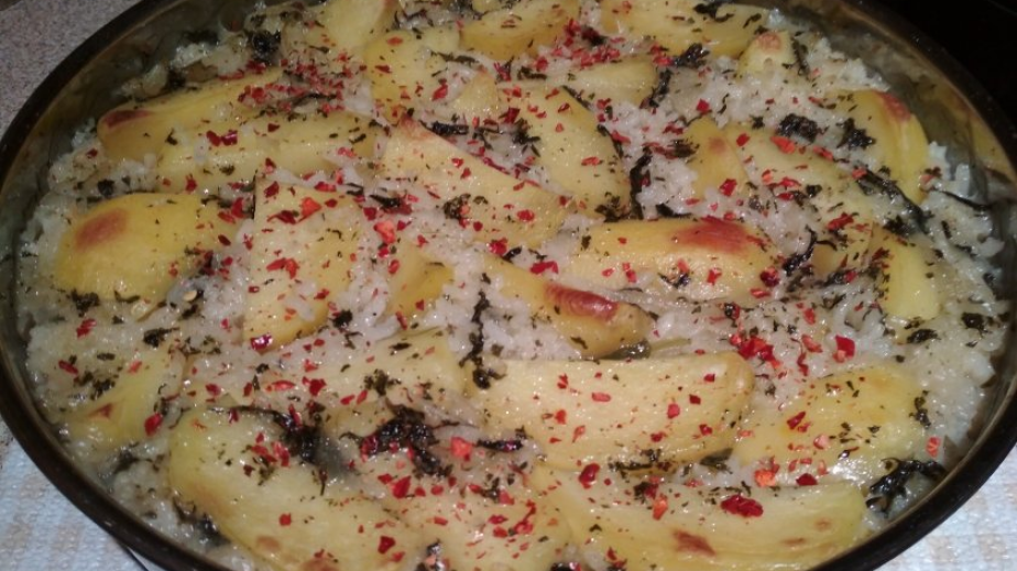 Подреждат се да потънат в ориза картофите, нарязани на едри полумесеци и се посолява.