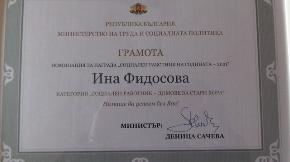 Министерство на труда и социалната политика номинира Ина Фидосова – Управител на Социални услуги – резидентен тип- Община Ковачевци за награда "Социален работник на годината -2021" в категорията "Домове за стари хора", във връзка със Световния ден на социалната работа- 16 март 2021г.