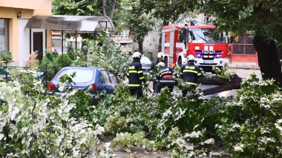 Аварийни екипи на ГЗ и БКС отстраняват паднали дървета и клони след силна буря.