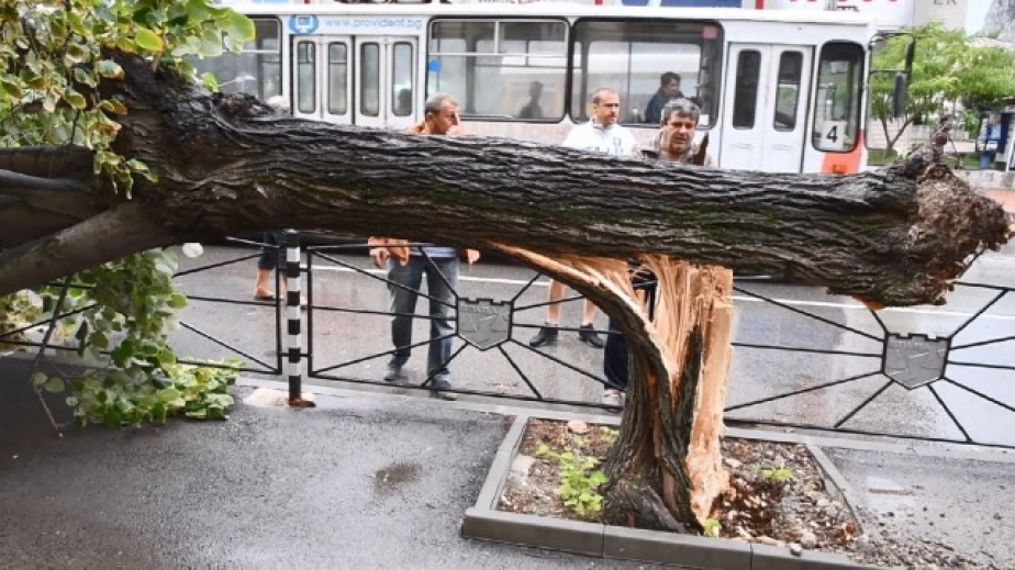 За секунди улиците се покриха с изпочупени клони и паднали листа. 40-годишна върба в центъра на града падна върху популярно кафене.