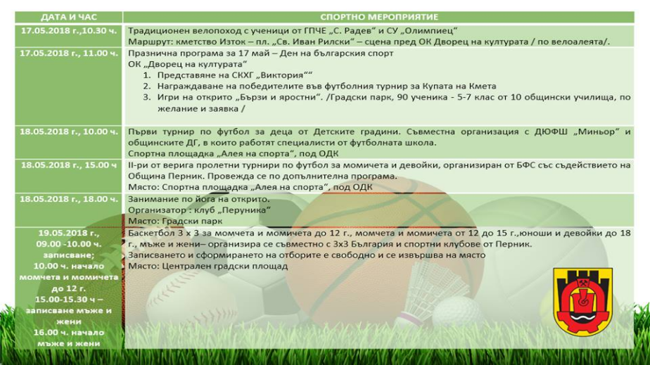 Ден на спорта събира любители на забавлението и силните емоции в Перник. За поредна година Община Перник организира различни спортни прояви за малки и големи. Събитието ще се проведе на 17 май, четвъртък. II-ри ученически велопоход ще стартира в 10:30 ч. от кв. Изток и ще завърши пред Двореца на културата в центъра на града, където в 11:00 ч. ще започне и официалната част, включваща демонстрации на Мажоретен състав при VI СУ "Св. Св. Кирил и Методий" и СК по художествена гимнастика "Виктория". Централният градски парк пък ще стане арена за игри на открито, наречени "Бързи и яростни", които ще започнат в 12:00 ч.