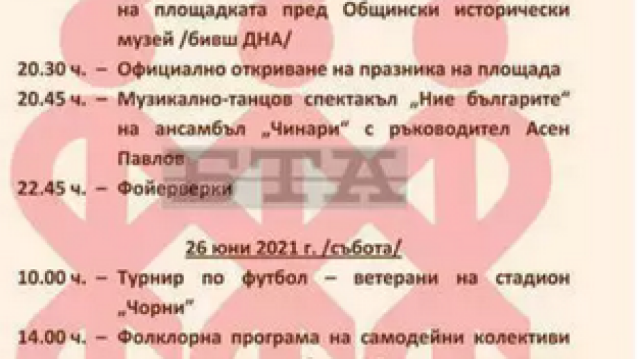Днес се открива големият граовски събор Видовден в Брезник. Празникът ще започне с детски пленер на тема "Вида-символът на Видовден". Довечера съборът ще бъде открит официално на централния градски площад, след което брезничани ще се насладят на музикално-танцовия спектакъл "Ние, българите". Фойерверки ще озарят началото на празника.