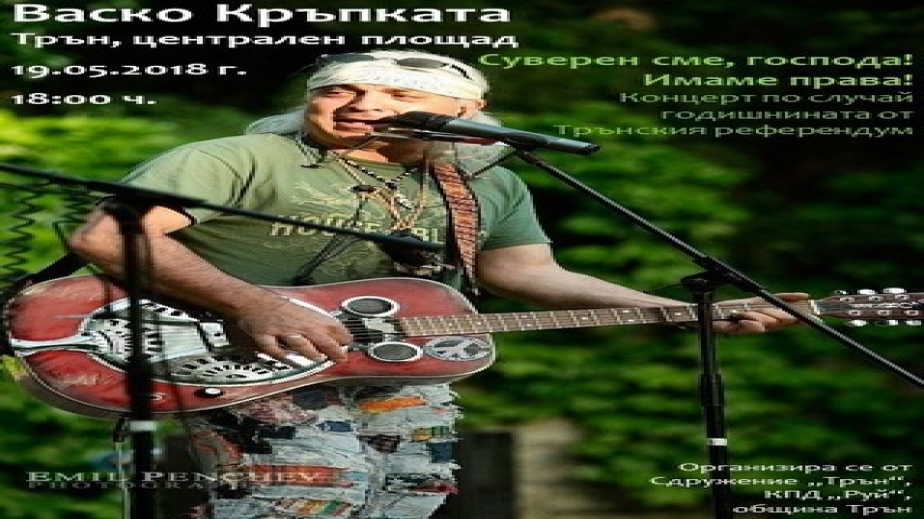 С концерт на Васко Кръпката Трън ще чества годишнината на местния референдум, състоял се на 11.06.2017 г. С него трънчани демонстрираха, че гражданското общество има законни средства за предотвратяване на неприемливи инвестиционни намерения. С вота си местните хора защитиха своята природа, своето здраве и своя поминък.