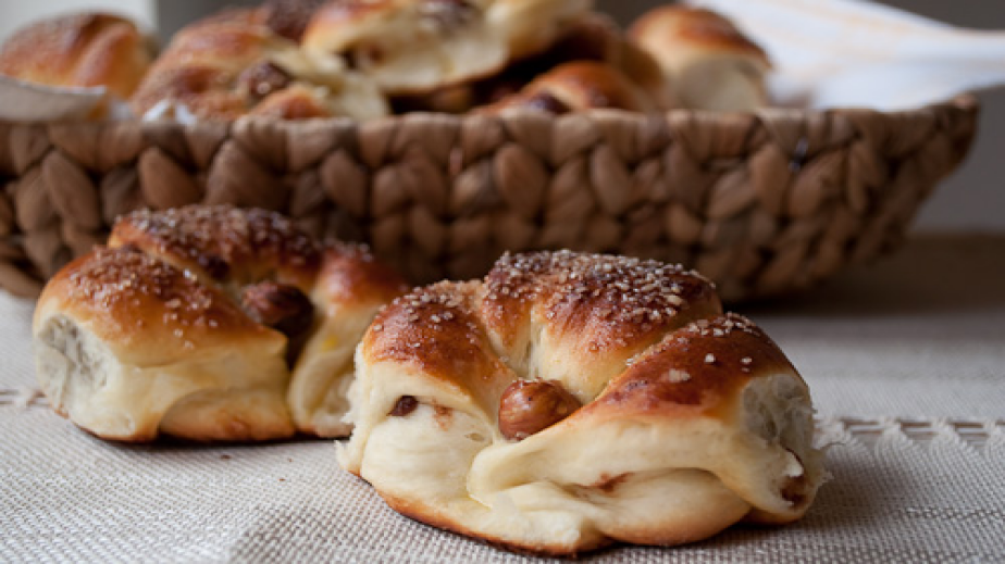 Брашното се пресява със солта в голяма купа. Към него се добавят 50 гр. захар, яйцето, ванилията, млечната смес и маята. Замесва се меко тесто. Прехвърля се върху набрашнена повърхност и се меси 3-4 минути докато стане гладко и еластично. Тестото се поставя в намазана с мазнина купа, покрива се с кърпа и се оставя на топло място за 1,5 часа докато удвои обема си.