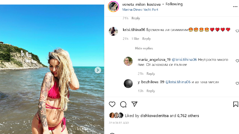 Една от най-колоритните участнички в „Ергенът“ – Венета, май бременна. Блондинката показа заоблено коремче от плажа. А феновете й веднага заподозряха, че устатата блондинка е в очакване на първа рожба. Венета многократно бе попитана в социалните мрежи дали е бременна. Но отговор от русото маце така и не последва.