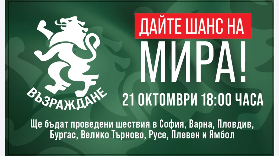 На 21 октомври от 18 ч. "Възраждане" организира национална акция "Дайте шанс на мира". Ще бъдат проведени шествия в София, Варна, Пловдив, Бургас, Велико Търново, Русе, Плевен и Ямбол. Разбира се, това е към този момент. Всеки, който желае, нека се чувства поканен да организира заедно с нас подобни шествия в своя град или село. Мирът и войната нямат партийна окраска, те важат за всички еднакво. В този момент обаче единствената политическа сила в България, която защитава мира, е "Възраждане".