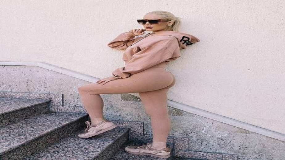 На кадъра певицата е избрала спортен екип от две части в нежно розово, част от колекцията на Victoria Beckham и Reebok. Това я нареди сред популярните дами, които са клиентки на Бекъм и демонстрират как носят изделия от колаборацията със спортния бранд.