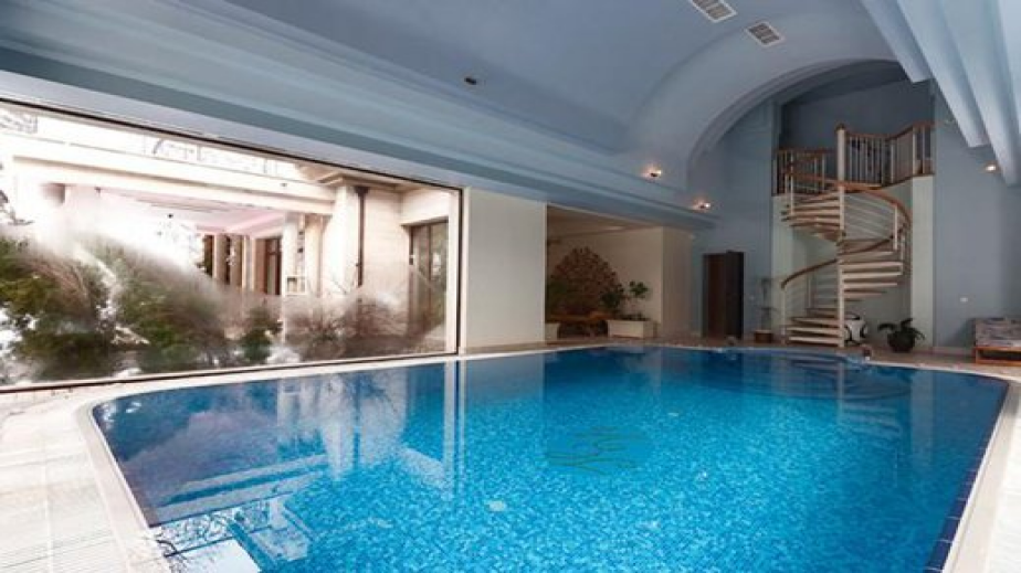 Най-атрактивен обаче е вътрешния басейн. Той се намира на първия етаж. Съвсем близко е до огромния хол. Отделен е от него със стъклени витрини.