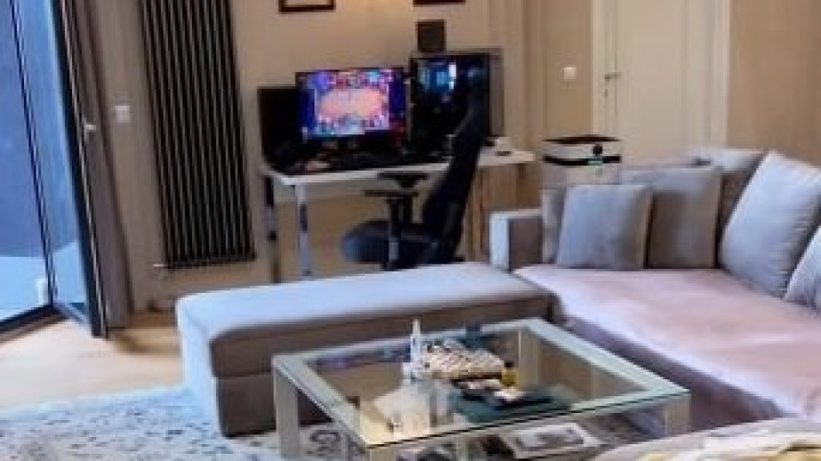 В апартамента Сашко си е оборудвам геймърски кът, става ясно от краткото клипче, което качи в социалната мрежа. Вижда се, че дневната е много просторна. В коридора пък има специална витрина, украсена с някои от ароматните произведения на Чоева./Източник: Лупа.бг