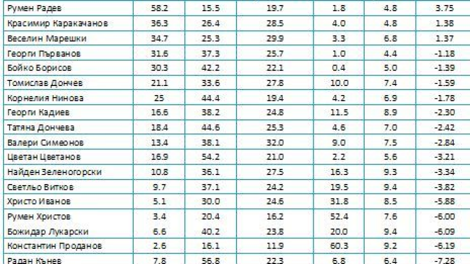 Почти всички български политици у нас са с отрицателен рейтинг на доверие. Изключение правят единствено президентът Румен Радев, съпредседателят на Патриотите Красимир Каракачанов и лидерът на новата формация „Воля“ Веселин Марешки. Те тримата бележат положителен рейтинг, сочат данните в ново проучване на ЕСТАТ.