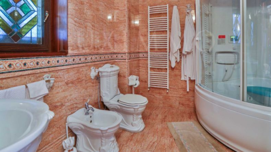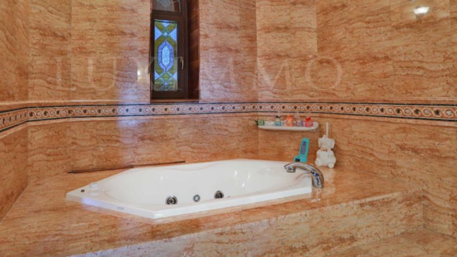 Имотът разполага с 3 огромни спални и 5 бани, в някои от които бидетата и тоалетните чинии са с позлатени елементи. На приземния етаж от вратата се влиза във фоайе, който води към огромния хол с кътове за сядане, камина и директен достъп към вътрешния двор. В съседство с хола е изграден пура бар и тоалетна за гости. От хола се преминава към просторна трапезария за 12 човека с красива камина.