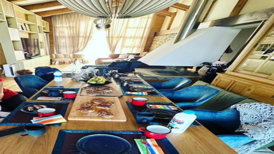 На фона на фототапетчето тя показва лъскави прибори, посуди и свещници, а също така и още една трапезария с голяма правоъгълна маса и столове, чиито цвят няма нищо общо с цветовата гама наоколо. Абе, гледай и пълней, както се казва.