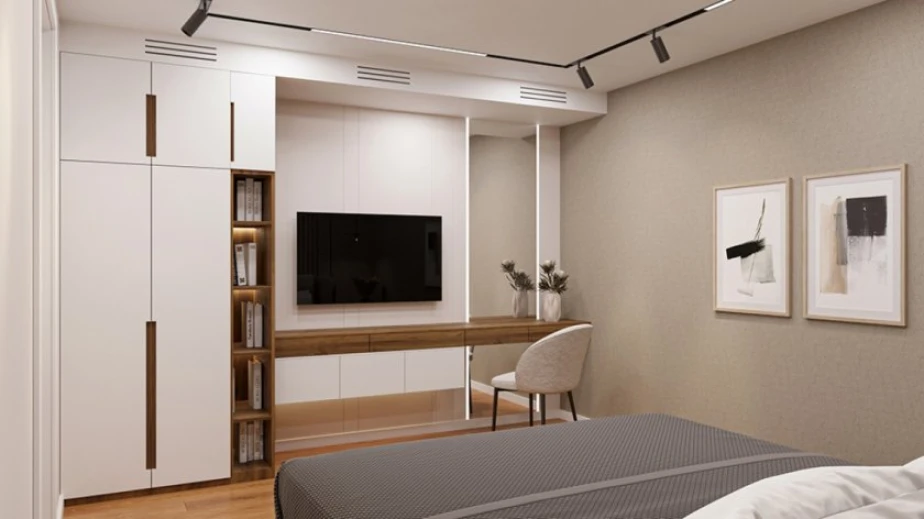 Спалнята предоставя уединение и спокойствие, като разполага с гардеробна част и обособен работен кът.