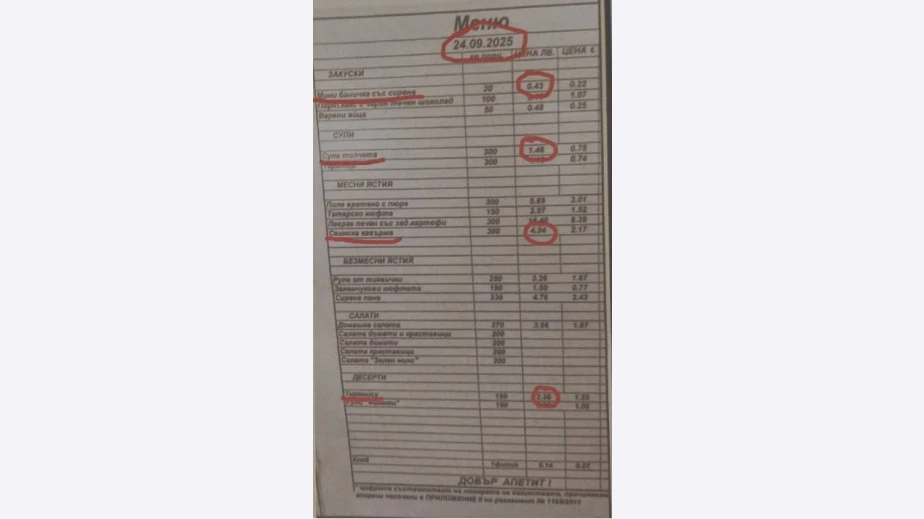 На 24 септември, сряда, бюфетът в Народното събрание предлага баничка само за 43 стотинки, както и домашно приготвена супа топчета за 1.46. тараторът е със стотинка по-евтин – 1.45. Голямото татарско кюфте пък струва едва 2.97, а свинската кавърма – 4.24 лв. Порция пиле вретено с картофено пюре е 5.89 лв.