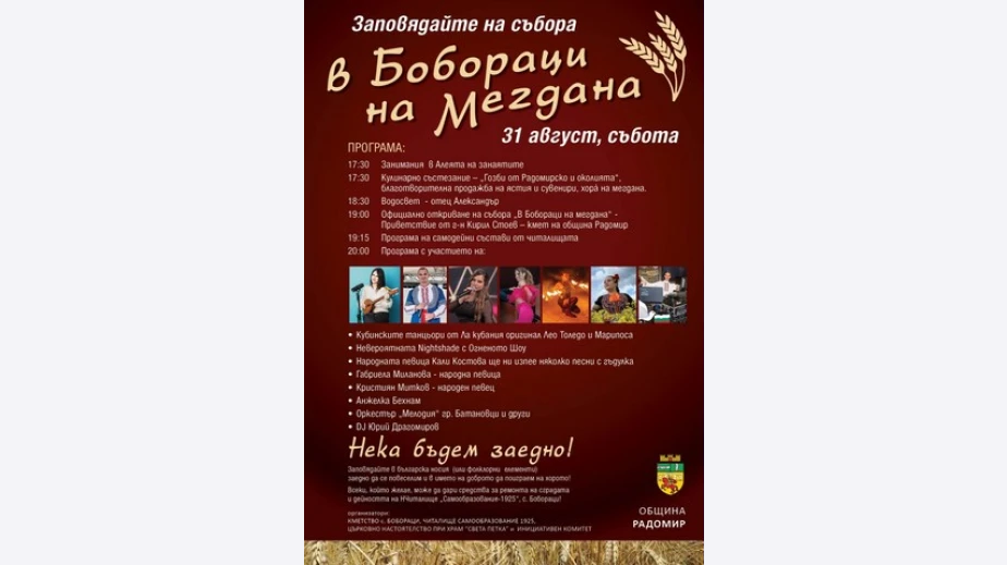Благотворителен събор ще се състои на 31 август в радомирското село Бобораци. Празникът под наслов "В Бобораци на мегдана" цели да набере средства за подпомагане на дейността и ремонт на сградата на Народно читалище "Самообразование 1925 г." в селото.