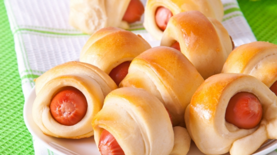 Разтворете маята в леко топлото прясно мляко заедно със захарта и оставете да се активизира.Направете кладенче в брашното в голяма тава. Сипете вътре прясното мляко, киселото мляко с разтворената в него сода, яйцето, солта. Хубаво объркайте и замесете гладко тесто.Оставете да втаса за около 1 час на стайна температура. Разделете го на 3 топки, разточете всяка на кръгла кора и изрежете триъгълници.Върху всеки триъгълник се маже малко горчица, слага се парченце обелен кренвирш (около 4-5 см дължина) и бързо и внимателно, без да се притиска прекалено, се завиват кифлички.Подреждат се в тава с хартия за печене, оставят се да починат за 15-20 минути, мажат се с разбито с малко вода яйце и се пекат в умерено загряна фурна.