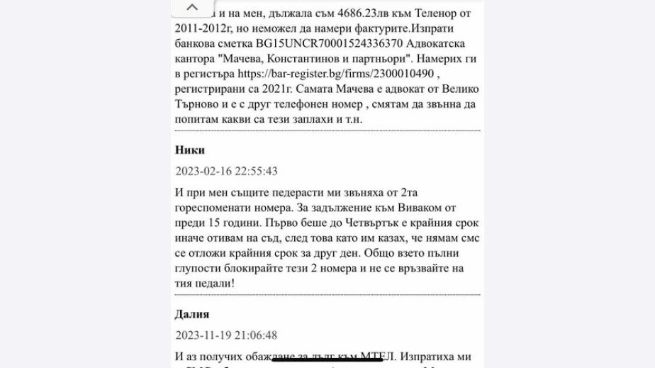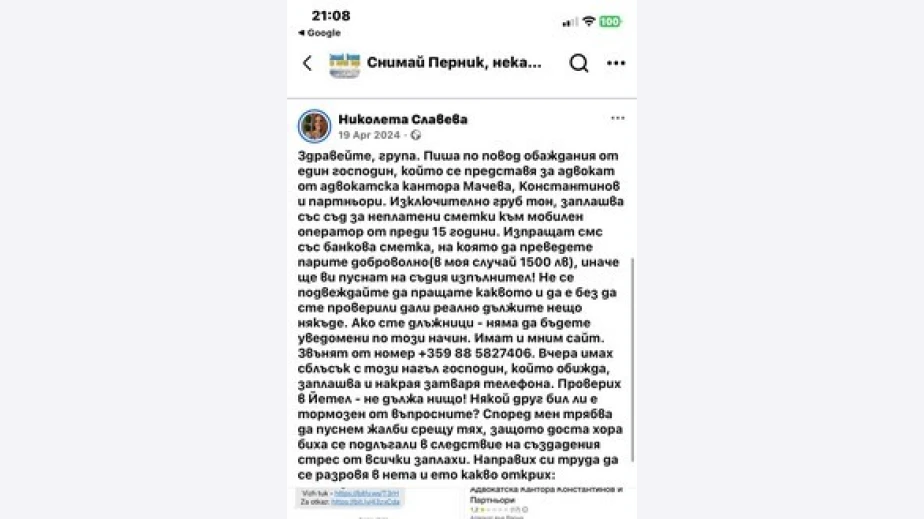 „Груб тон на мъж отправя заплахи със съд за неплатени сметки към мобилен оператор от преди 15 години. Господинът се представя за адвокат от адвокатска кантора Мачева, Константинов и партньори“, разказва Лъчезар Станимиров.