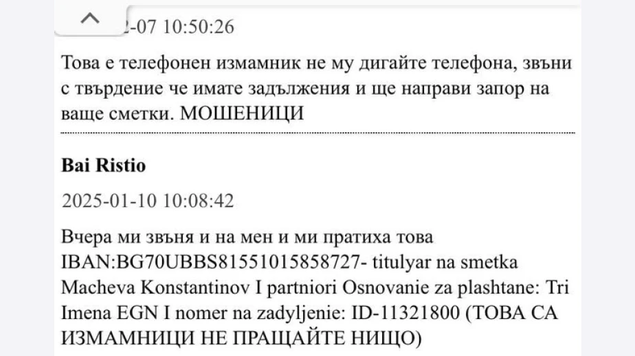 По думите му измамниците изпращат СМС с банкова сметка, по която да се преведат парите доброволно, в противен случай заплашват със съдя изпълнител. Телефонните номера са: 0886 849 378 и 0885 827 406