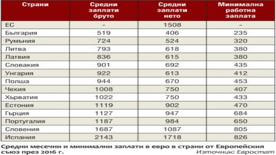 Според него България продължава да е с най-ниското средно месечно възнаграждение – 406 евро, при средно 1508 евро за целия ЕС. Българите получаваме и най-ниската минимална заплата в ЕС – 235 евро, при 1498 евро в Германия, според данни на Евростат за 2016 г. Данните показват още, че България има и едно от най-високите нива на доходно неравенство, което допълнително изостря проблема с бедността.