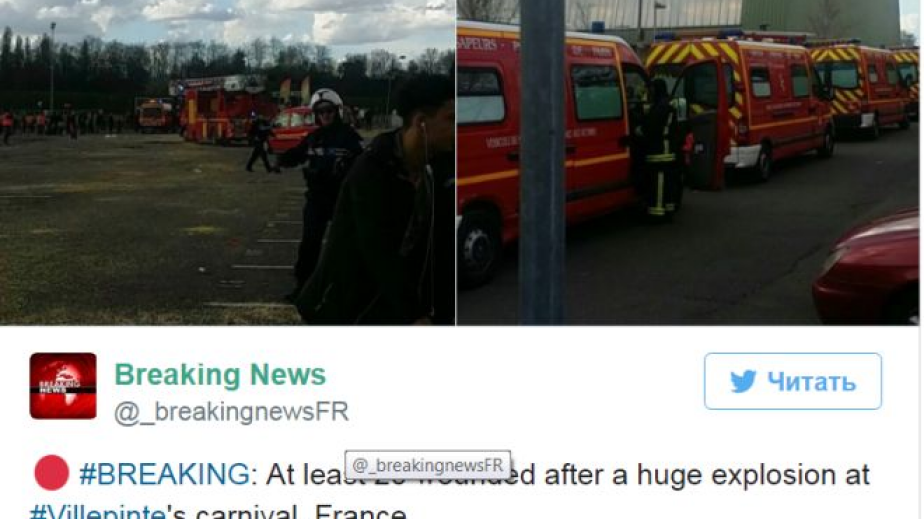 Най-малко 30 души са били ранени при взрив по време на карнавал в предградието на Париж Вилпинтхснощи, пише Дейли Стар. Съобщава се, че трима или четирима от пострадалите са в критично състояние. Взривът е избухнал в 17:30 часа местно време (18:30 българско).