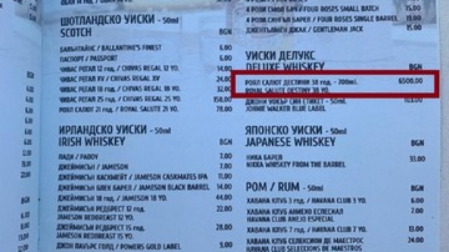Пловдивчанин е седнал на бийч бар „Delete”, който част от комплекса „Oasis”, собственост на Евелин Банев - Брендо. Концесионерът на плажа, който държи и заведението, е сложил цена на шатрата 200 лева, а за чадър с два шезлонга цените са „народни” – по 9 лева с два шезлонга. А менюто в заведението е зашеметяващо - много богато и много скъпо. Повечето пици са между 20 и 45 лева за 400 грама. Салатите са от 17 до 25 лева, пастата започва от 20 лева, мелбата е 15 лв., показват снимки от ценовата листа. Както се вижда, плажният бар за баровци предлага дори бутилка 38-годишно уиски "Роял Салют Дестини" - за ценители срещу .... 6500 лева (шест хиляди и петстотин).
