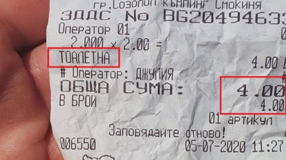 2 лева струва едно посещение на тоалетна на къмпинг "Смокиня", сподели журналистът Иво Никодимов във Фейсбук. Той е приложил и доказателство - снимка на касов бон, която показва, че две влизания във WC са били таксувани за 4 лева. "После защо в храстите имало екскременти :)", коментира Никодимов. Той прави и интересен паралел с положението на гръцки плаж - срещу 6 евро летовникът получава фрапе, фредо еспресо, две води, два шезлонга, чадър и барбарон и тоалетната е безплатна, посочва журналистът.