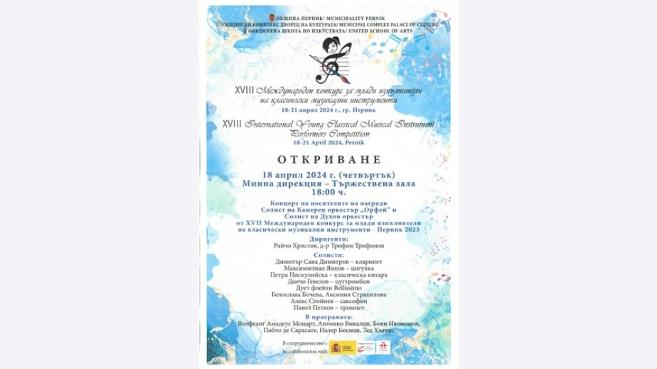 Конкурсът за млади изпълнители на класически музикални инструменти и конкурсът за детска рисунка се организират от Общински комплекс Дворец на културата – Обединена школа по изкуствата, с подкрепата на Община Перник. Откриването на XVIII-то издание на Международния конкурс за млади изпълнители ще се състои на 18 април /четвъртък/ от 18:00 ч. в Тържествената зала на Минна дирекция. Церемонията по награждаване и откриването на изложбата на отличените рисунки ще се проведе на 19 април /петък/ от 15:00 ч. в Минната дирекция.