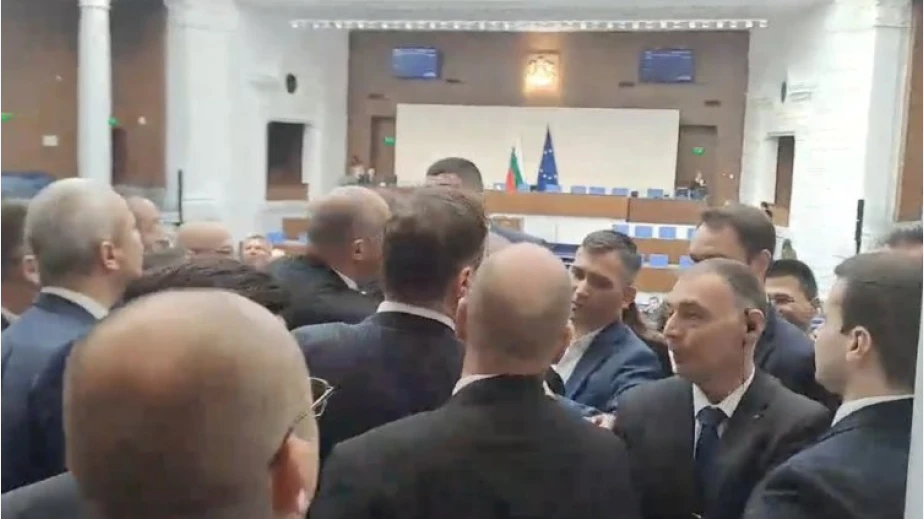 След дълга размяна на реплики между представителите на двете формации, депутатът от ДБ Ивайло Мирчев скочи от мястото си и отиде в задната част на залата, където се сблъска с лидера на "Възраждане" Костадин Костадинов и други представители на партията.