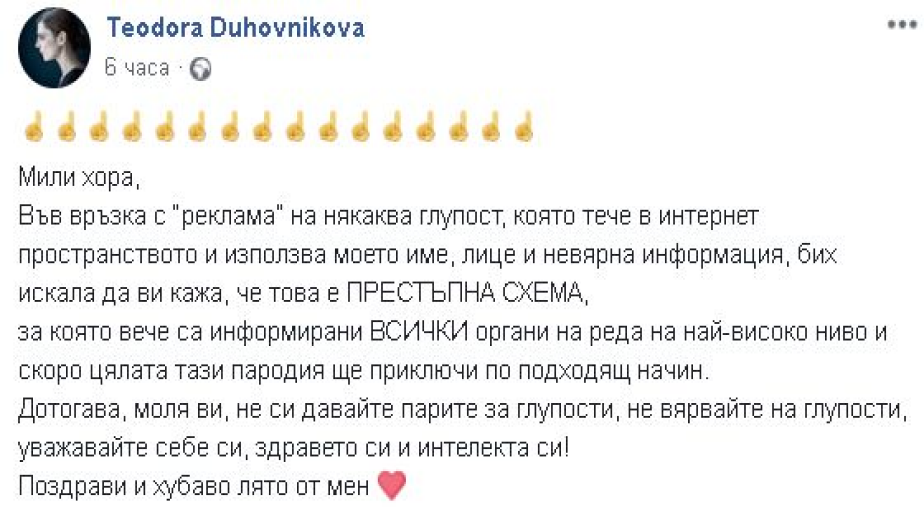 Нагла престъпна схема окраде сексапилната актриса Теодора Духовникова. За чутовната измама сигнализира самата тя в личния си фейсбук профил.