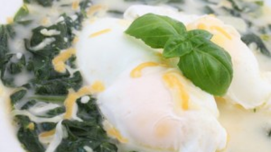 Почистете копривата и я попарете за 30 секунди във вряща вода. Отцедете я. В тиган загрейте масло и изсипете попарената коприва. Разбъркайте и добавете сол, малко черен пипер и соев сос.Настържете 250 г пармезан (може кашкавал или друг вид миризливо сирене). Объркайте за минута и свалете от котлона.В тенджерка кипнете вода и направете забулените яйца. В чиния направете канапе от копривата, а отгоре поставете по 2 забулени яйца.Поднесете със стрък босилек.