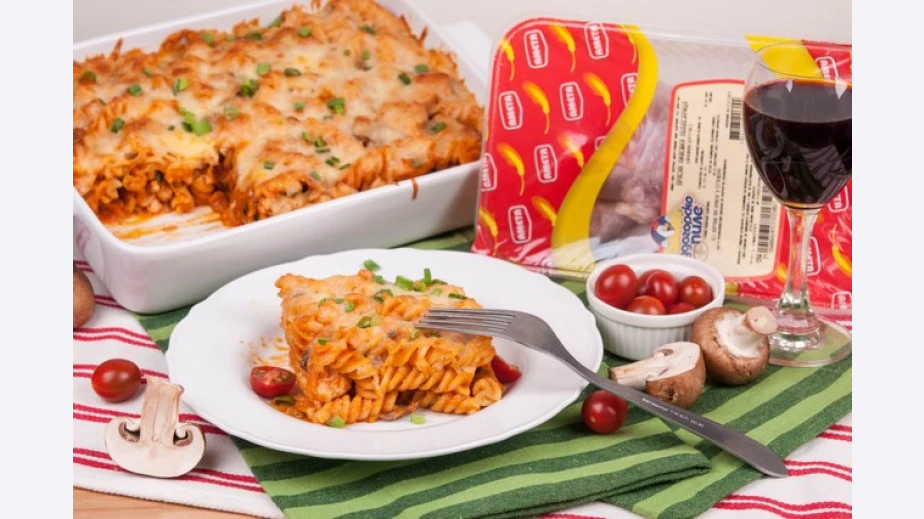 Запеканката с пиле, паста и доматен сос е вкусна и изключително непретенциозна идея за ястие, която може да приготвите с почти подръчни продукти всеки ден. Това е рецептата, която дава отговор на въпроса “Какво да сготвя набързо?” и не само че дава бърз отговор, а дава и вкусен отговор, който ще зарадва всички удома. Рецептата за запеканка с пиле, паста и доматен сос може да бъде наречена и рецепта за фалшива лазаня с пиле, защото като вкус и текстура напомня любимото ястие. За получаване на желания резултат заложете на познатото и вкусно пилешко месо от Лудогорско пиле.