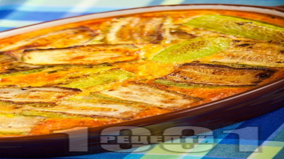 Тиквичките (1 кг) се измиват, почистват и нарязват на филийки. Изпържват се до омекване в олиото (1/2 к.ч.). Отделно се запържват ситно нарязаният пресен лук (1 връзка) и оризът (1 к.ч.). Добавя се горещата вода (1 ч.ч.) и настърганите домати (2 бр) и се задушава, докато оризът поеме течността. Добавят се ситно нарязаните магданоз (1/2 връзка) и копър (1/2 връзка), както и солта и черният пипер (1 ч.л.). Разбърква се добре. В тавичка се редят филийки тиквички, плънка от ориз и отново тиквички. Ястието се залива с разбитите яйца (3 бр), прясно мляко (1 ч.ч.) и брашно (3 с.л.) и се пече до златисто при температута от 180 градуса./Рецептата е взета от 1001recepti.com
