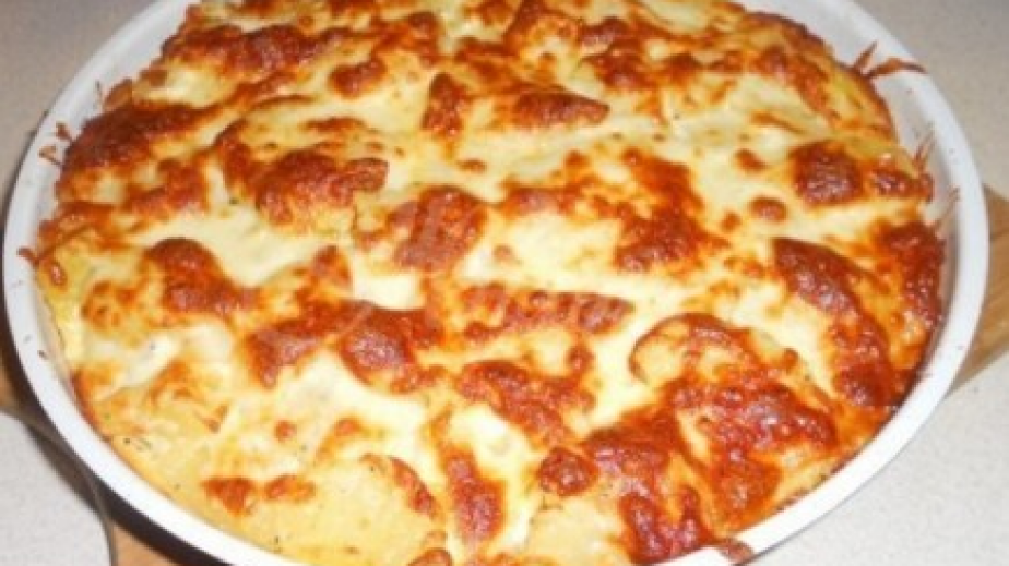 Картофите се обелват и се нарязват на тънки колелца, поръсват се със сол и черен пипер. В намазана с олио тавичка се редят, картофи, отгоре шунка, после гаудата и така докато имаме продукти. Най-отгоре се покрива с настърганата моцарела и се залива с яйцата разбити със сметаната. Пече се 40 минути в загрята на 200 градуса фурна. Ако започне да се зачервява прекалено отгоре, може да сложите алуминиево фолио./Рецептата е вззета от zajenata.bg