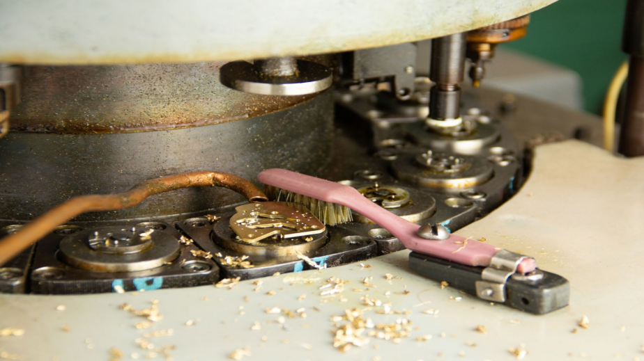 Производството на тези компоненти е изцяло свързано с превръщането на плоско парче месинг в изключително прецизен и сложен компонент за механизъм на часовник. Това се прави чрез рязане на метал с високоскоростни въртящи се ножове. По време на процеса на фрезоване се получават стружки, а ролята на четката за зъби е да изтърка детайла (и държача, върху който е фиксиран детайлът) и да отстрани стружките. Това е изключително важна стъпка. Всяка мръсотия, която остава върху тези повърхности, може да повлияе на прецизността на следващите операции на фрезоване и на по-късен етап, на прецизността на самия часовник.