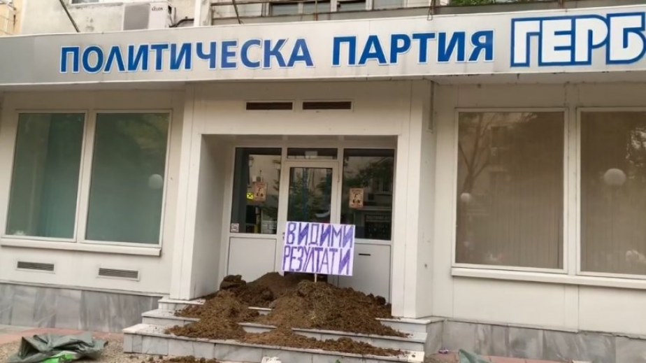 Офисът на партия ГЕРБ в Стара Загора днес бе подложен на обсада. Протестиращи засипаха входа на сградата с тор, като надписът върху камарата гласеше „Видими резултати”.