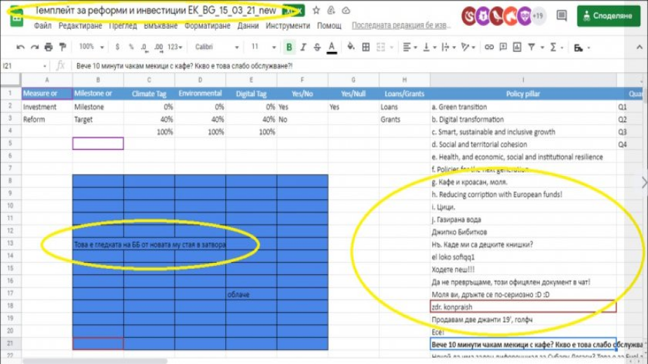 Файлът се оказа качен без всякакви защити в публичното пространство в платформата Google Drive, в която абсолютно всеки може да редактира без последствия и филтър, което накара десетки българи да се пошегуват с гафа и лично да разпишат възгледите си по финансовата рамка, включително с известни лафове от мрежата като