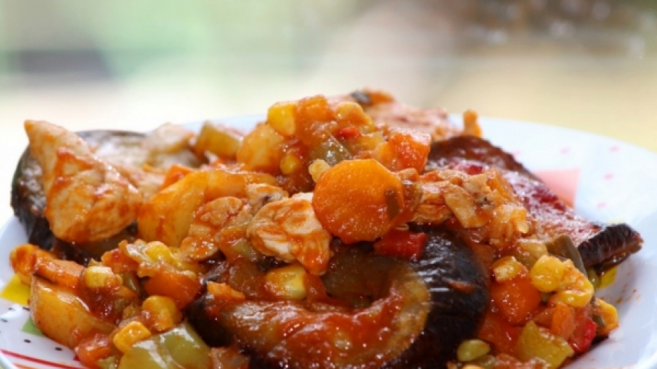 Запържваме нарязания на ситно кромид лук, след това прибавяме пилешкото месо.След като се запържат се добавя доматен сос с пилешки и зеленчуков бульон и изсипваме мексиканския микс.След 5 минути сместа се изсипва в тавата и отгоре се нареждат картофите, чушките и патладжаните (нарязани на колелца). Пекат се на 250 градуса за 40 минути.